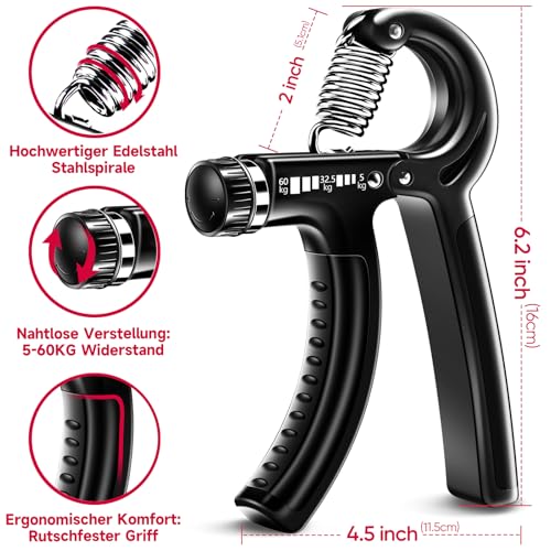 𝗞𝗢𝗠𝗙𝗢𝗥𝗧𝗔𝗕𝗘𝗟 𝗨𝗡𝗗 𝗟𝗔𝗡𝗚𝗟𝗘𝗚𝗜𝗚 — Dank des ergonomischen und weichen Griffs des liegt der Handtrainers zur Kraftsteigerung angenehm in der Hand. Geeignet für kleine und große Hände, Senioren und Jugendliche. Der Widerstand der Handtrainer kann leicht von 5 bis 60 kg eingestellt werden, ideal für Männer und Frauen mit unterschiedlicher Stärke. Sie können den Handtrainer überall und jederzeit verwenden, super einfach in der Anwendung!