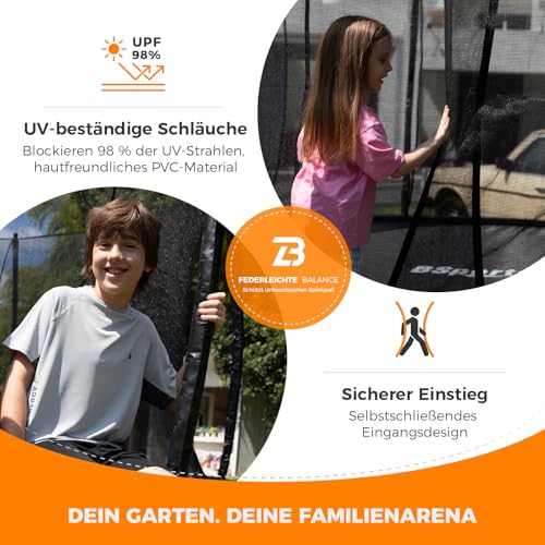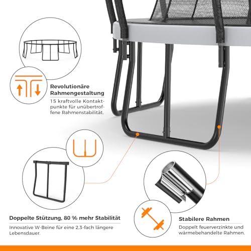 Zertifizierte Stabilität & Sicherheit für die ganze Familie Mehr Standfestigkeit durch 5 W-förmige Beine: Unser innovatives Design bietet eine spürbar höhere Stabilität als Trampoline mit nur 4 Standardbeinen. Das Ergebnis: Eine großzügige Gewichtskapazität von bis zu 204 kg (450 lbs) dynamischer Belastung, die Springspaß für mehrere Familienmitglieder gleichzeitig ermöglicht. Das Produkt entspricht den europäischen (CE) und amerikanischen (ASTM) Sicherheitsnormen und bietet mit einer statischen Belastbarkeit von 680 kg (1500 lbs) ein ausgezeichnetes Sicherheitsprofil für lang anhaltende Freude.